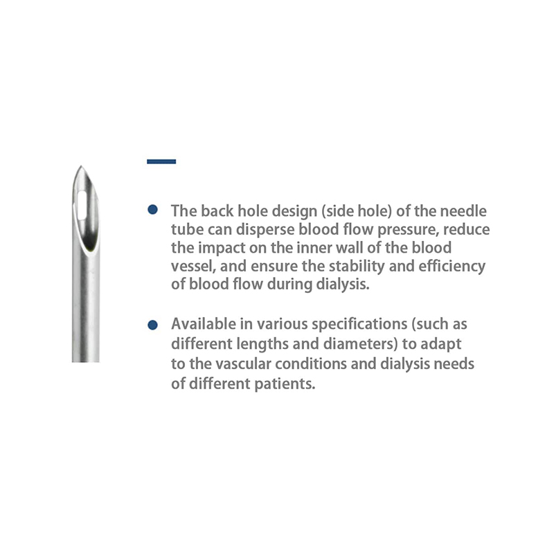 The back hole design (side hole) of the needle tube can disperse blood flow pressure, reduce the impact on the inner wall of the blood vessel, and ensure the stability and efficiency of blood flow during dialysis.
